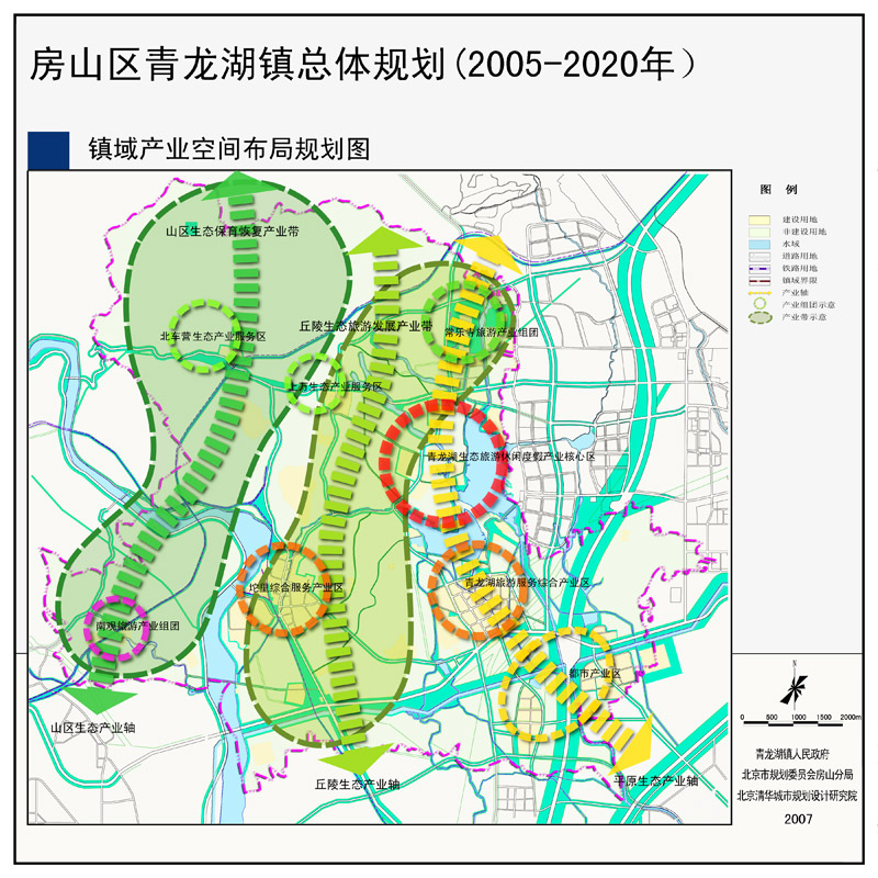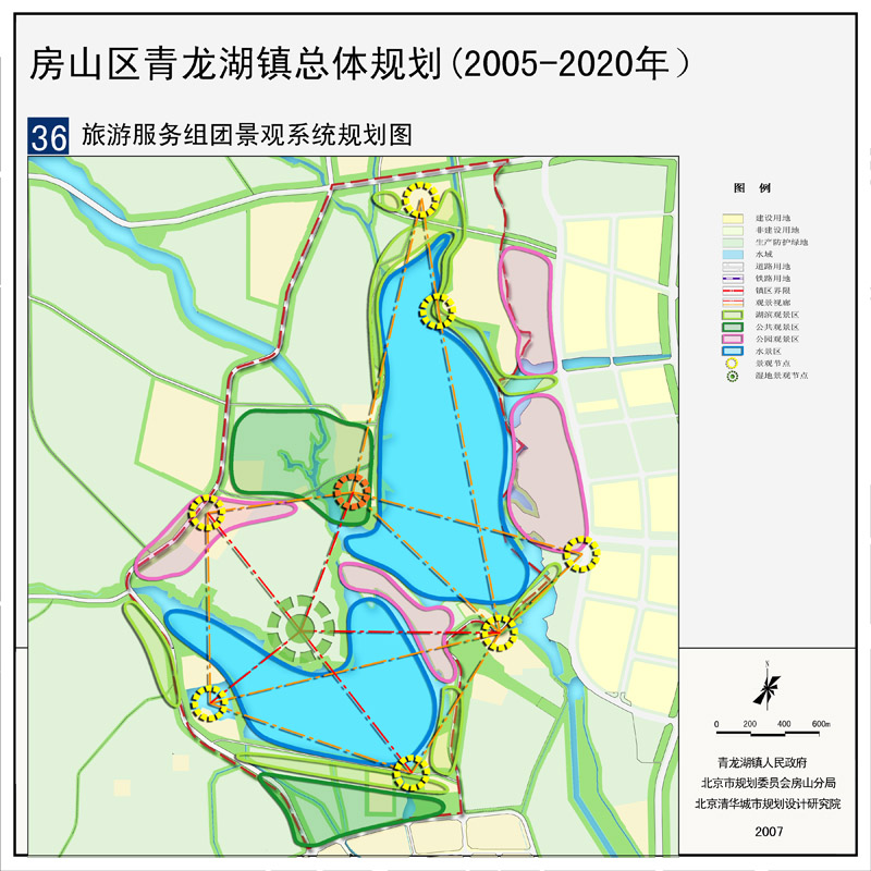 旅游服务组团是青龙湖镇产业就业中心,依托崇青水库发展旅游产业,成为房山区旅游会展基地,解决城镇人口的广泛就业。组团内部环湖形成以水体景观为中心、散点布局旅游服务设施的整体景观布局,加强节点的景观呼应,营造人工景观和自然景观和谐共生的特色旅游资源。