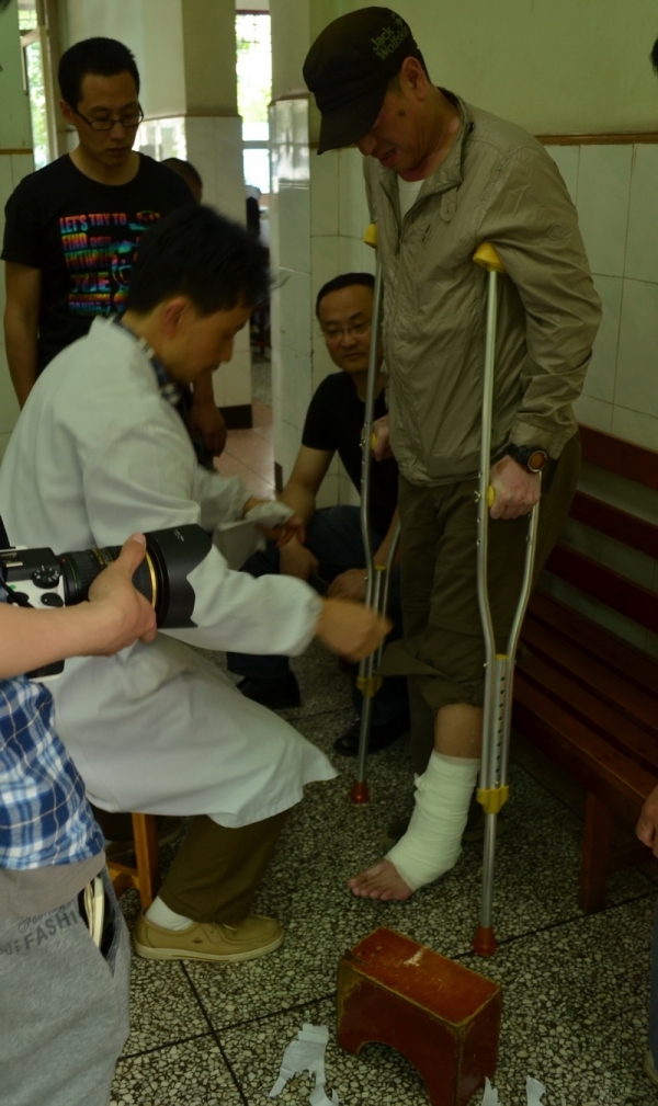 今天的现状踏勘中,身为第一组领队的尹稚教授不慎歪伤左脚,造成轻微骨折。经天全县中医院骨科名医的精心治疗,伤情得到很大缓解。尹稚教授的伤情受到了很多人的关注和祝福,在此尹稚教授感谢大家的关心。